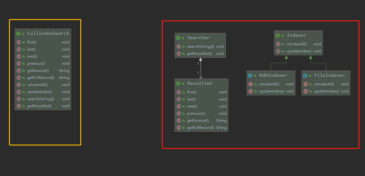 改进:对该接口进行我角色划分,拆分成:搜索器角色,索引生成器角色,搜索结果集角色;明确各个角色的职能范围。